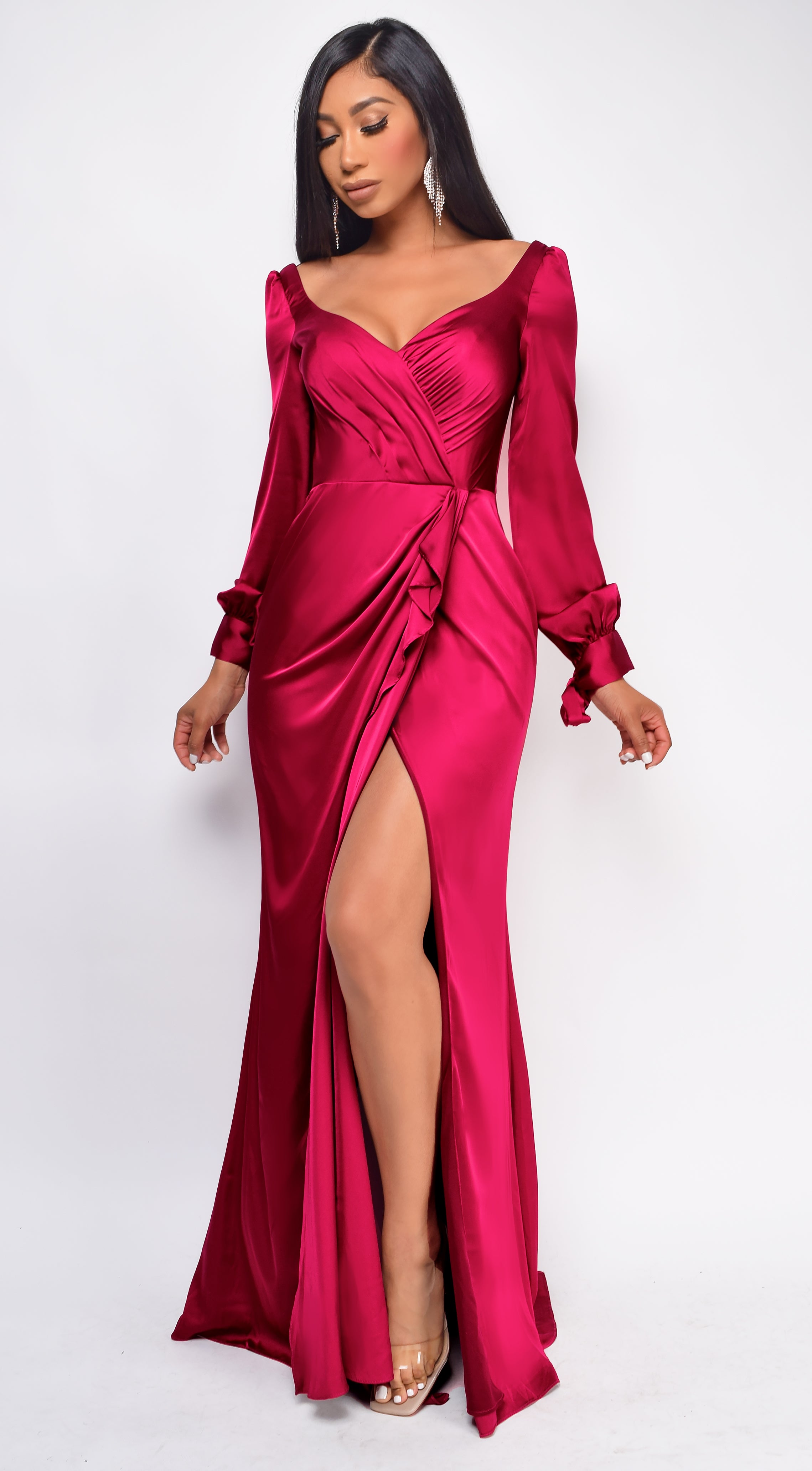 Adalina Burgundy Red Satin Wrap Slit Gown