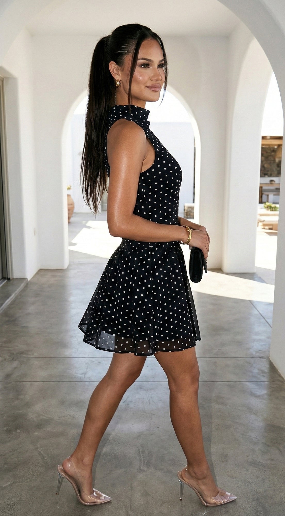 Chic and timeless, the Colette Polka Dot High Neck Mini Dress features a sleek sleeveless silhouette with a refined high neckline that highlights the shoulders. The fitted bodice flows into a softly flared mini skirt for a flattering shape and graceful movement, while the classic polka dot print adds a playful vintage inspired charm. Perfect for daytime events, dinners, and stylish evenings out.
