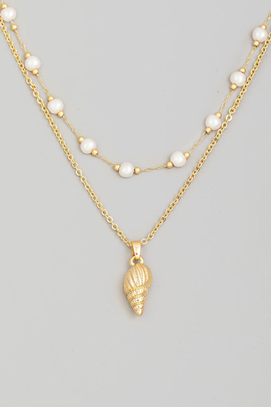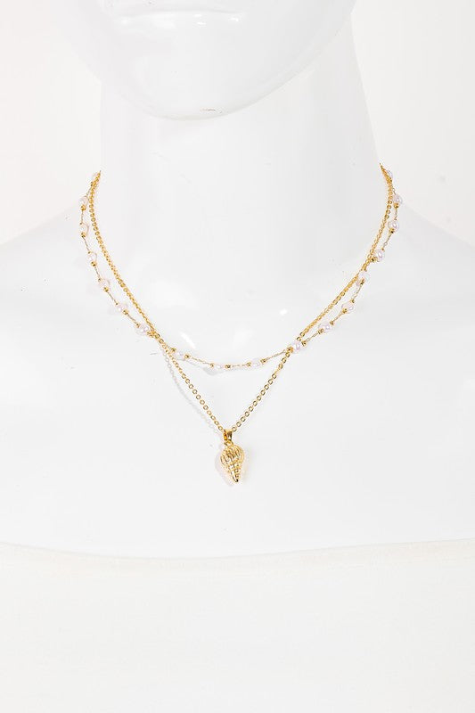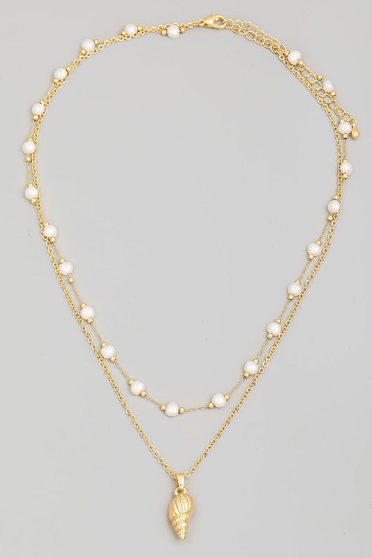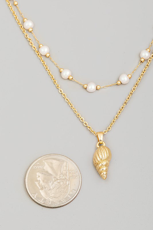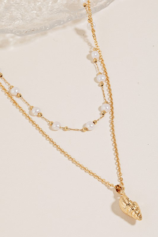 Conch Charm Pearl Beads Layered Necklace - Gold