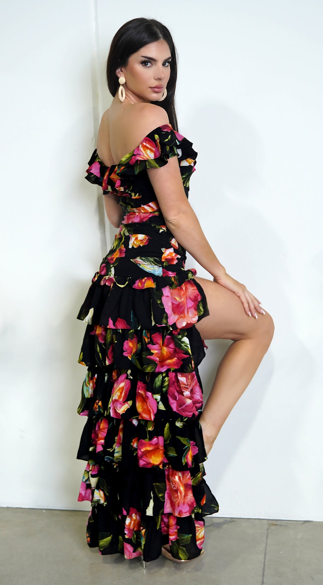 Eivissa Floral Off Shoulder Ruffle Tier Maxi Dress - Black
