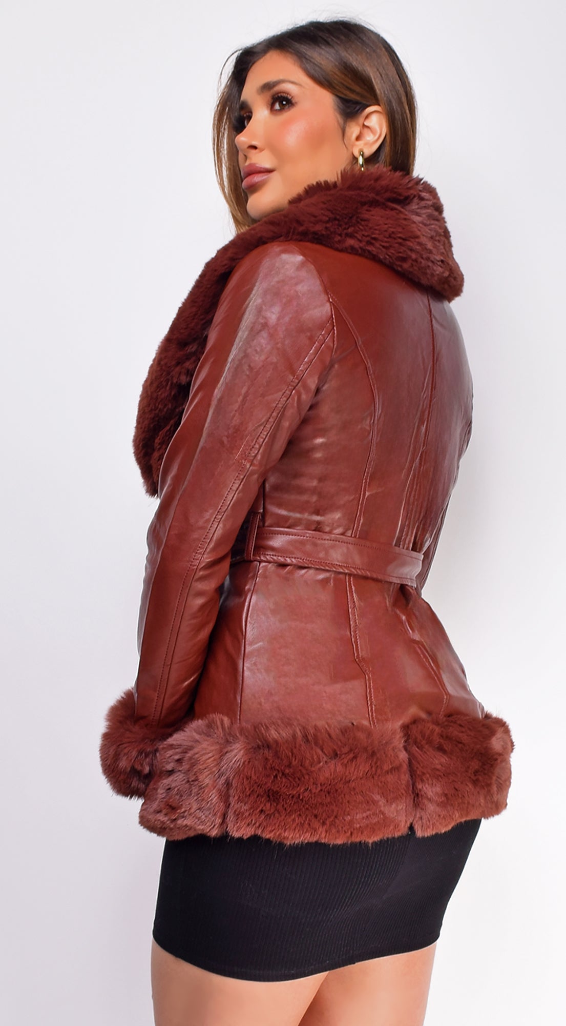 Ekaterina Brown PU Leather Belted Coat