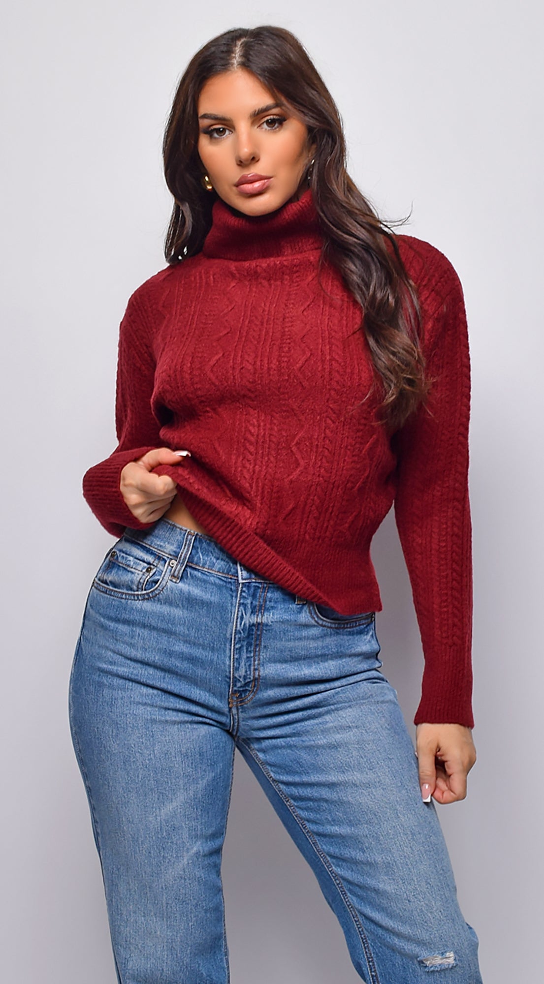 Gisella Cable Knit Turtle Neck Sweater Top - Burgundy