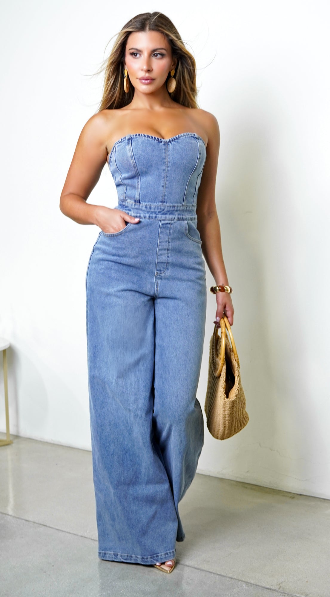 Halo Strapless Wide Leg Denim Jumpsuit - Blue