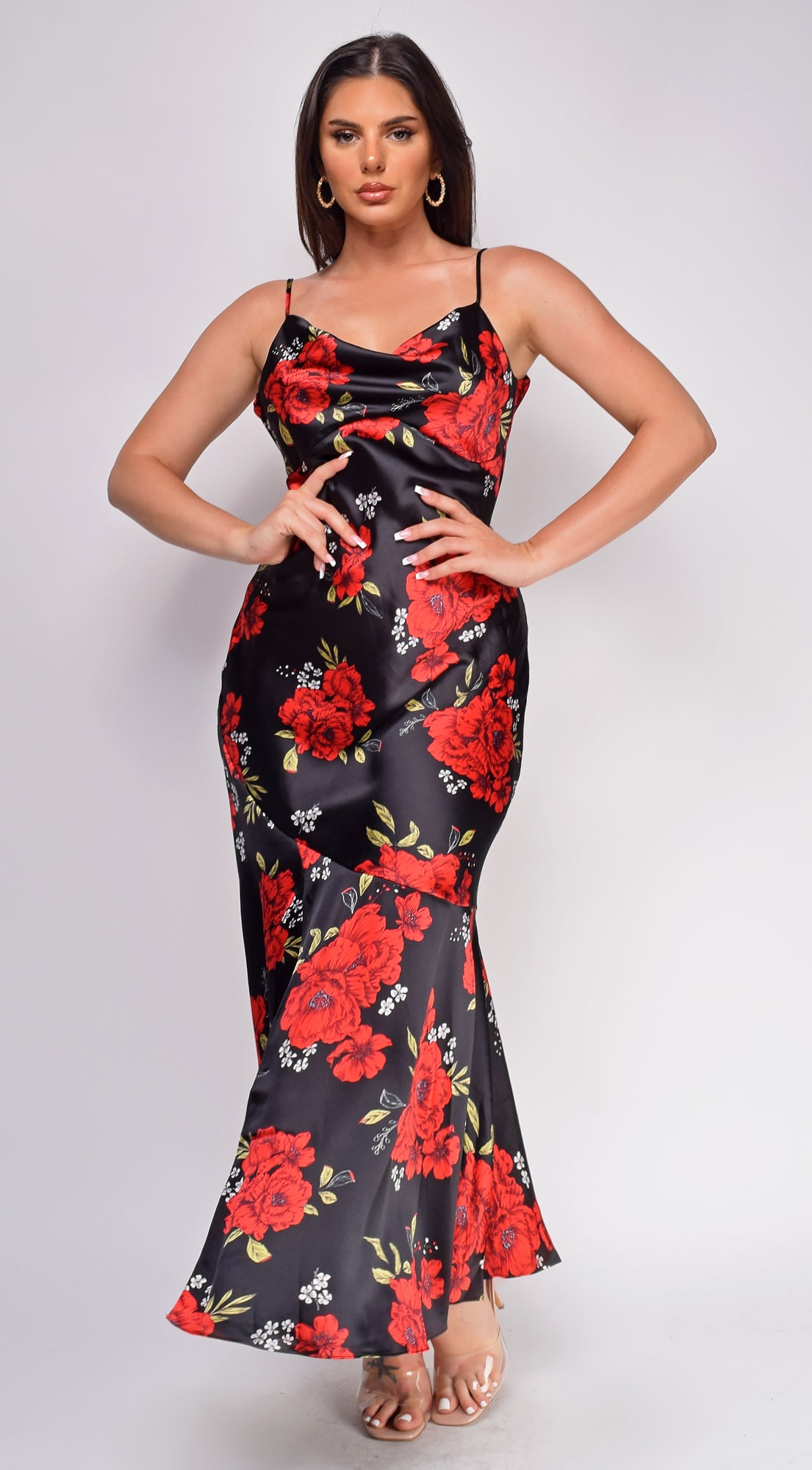 Isabel Black Red Floral Print Satin Cowl Neck Maxi Dress
