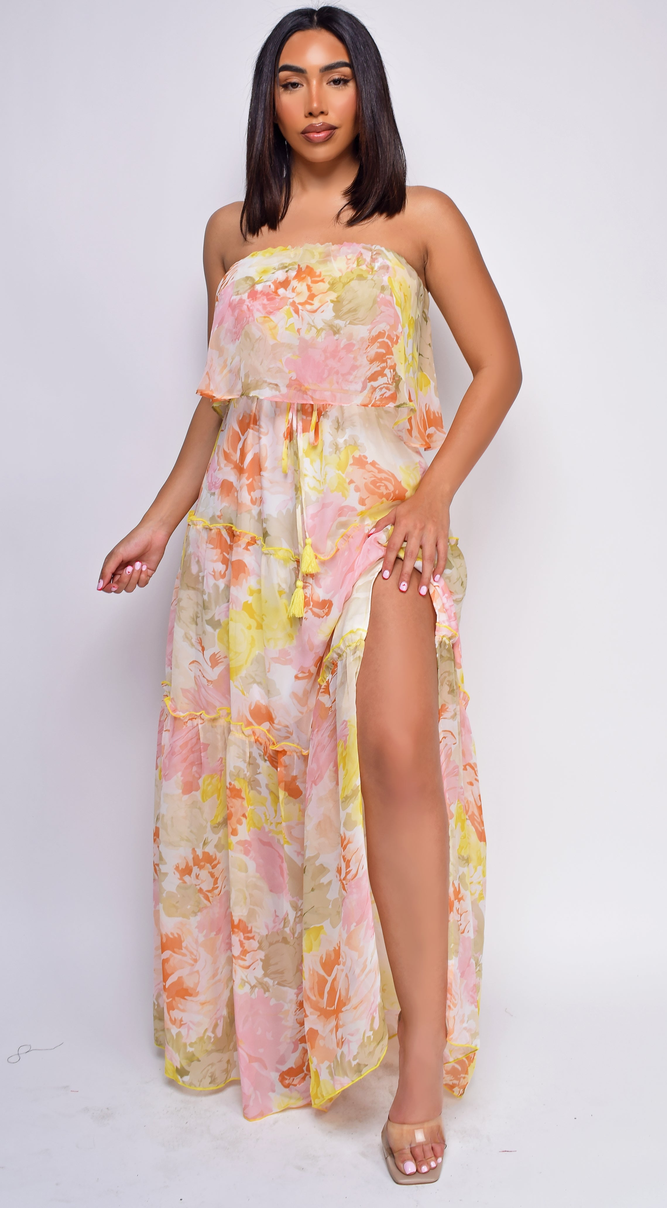 Kelly Yellow Multi Floral Print Tube Sleeveless Side Slit Dress