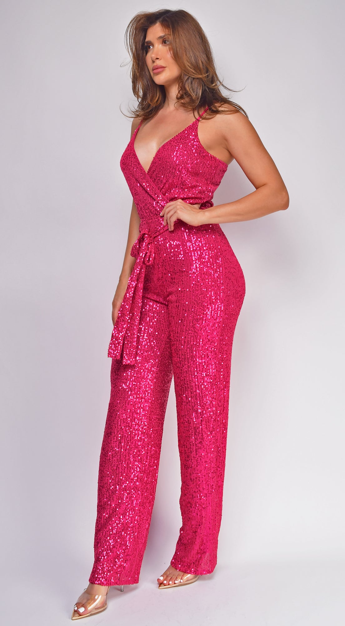 Kyla Hot Pink Surplice Sequin Jumpsuit