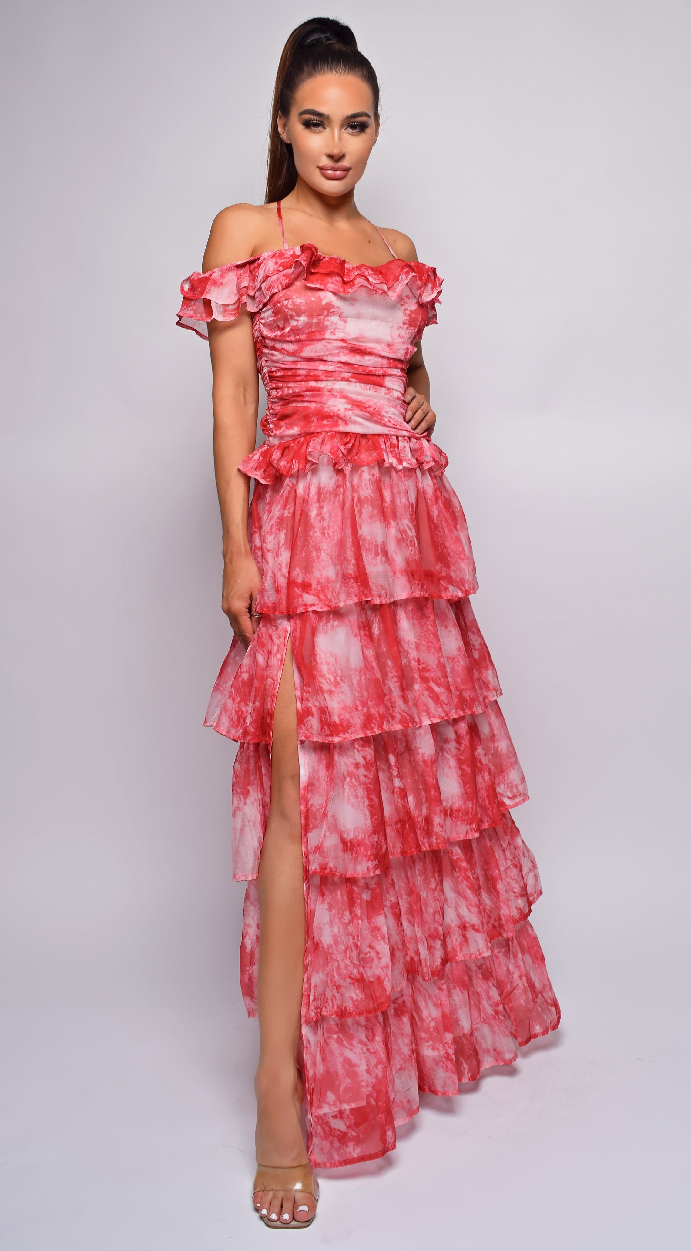Lavera Red Tie Dye Ruffle Side Slit Maxi Dress