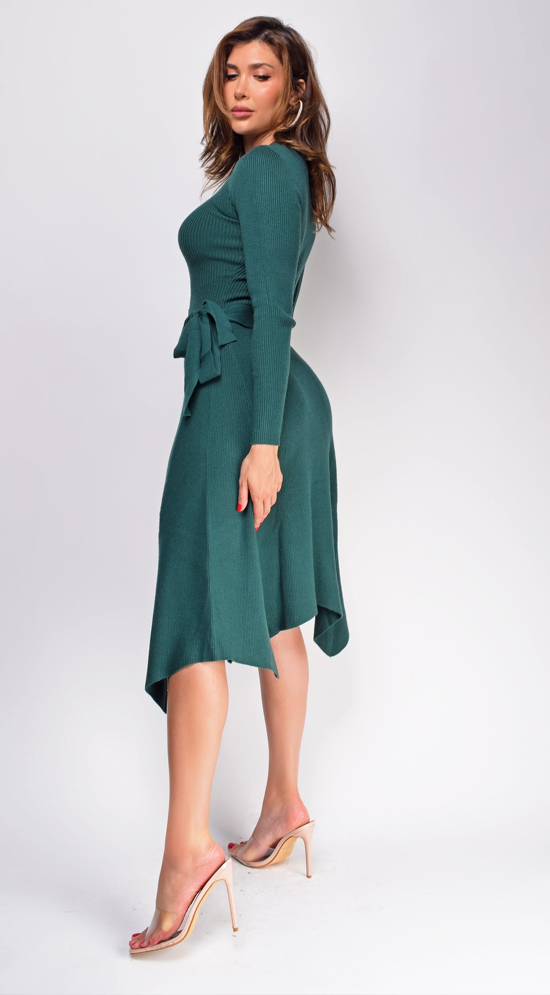 Lyia Green Ribbed Flare Sweater Midi Dress