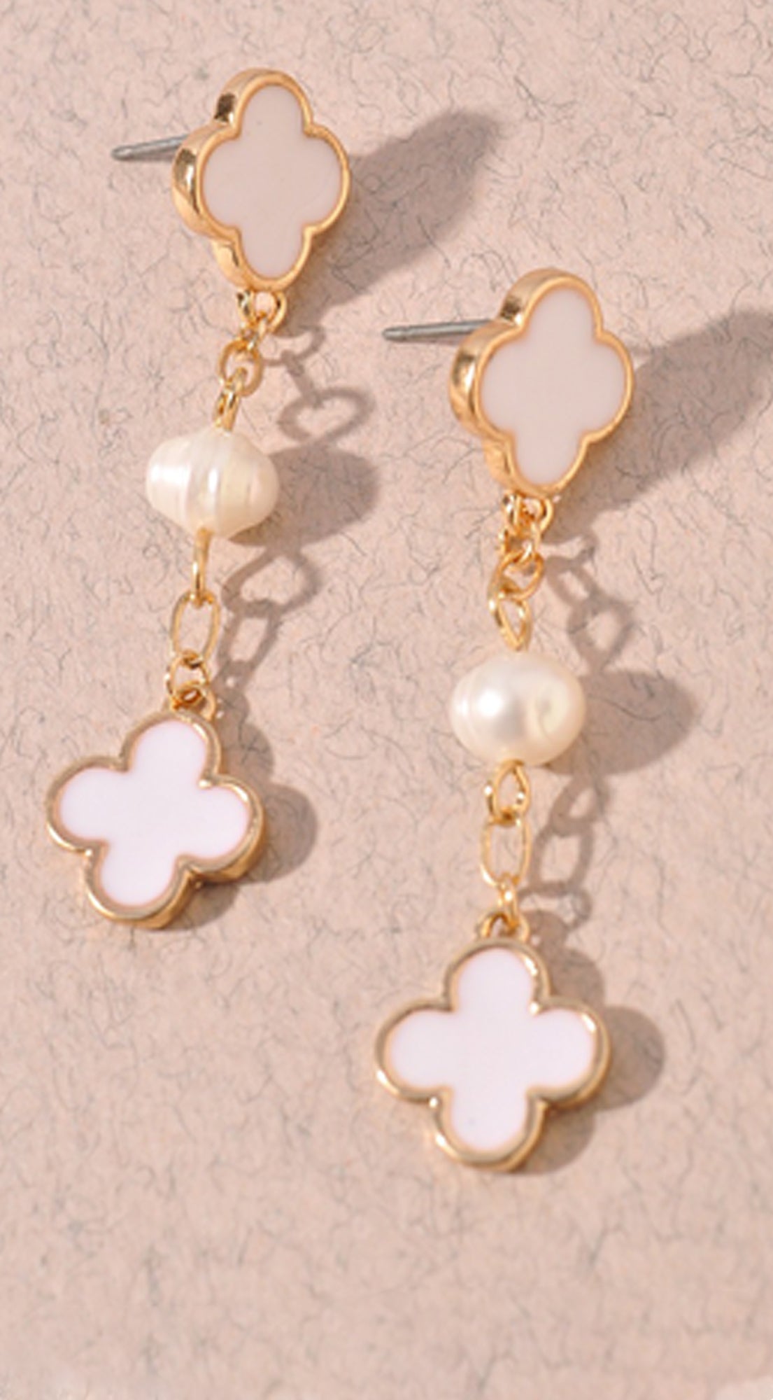 Mya Clover & Fresh Water Pearl Chain Earrings - White