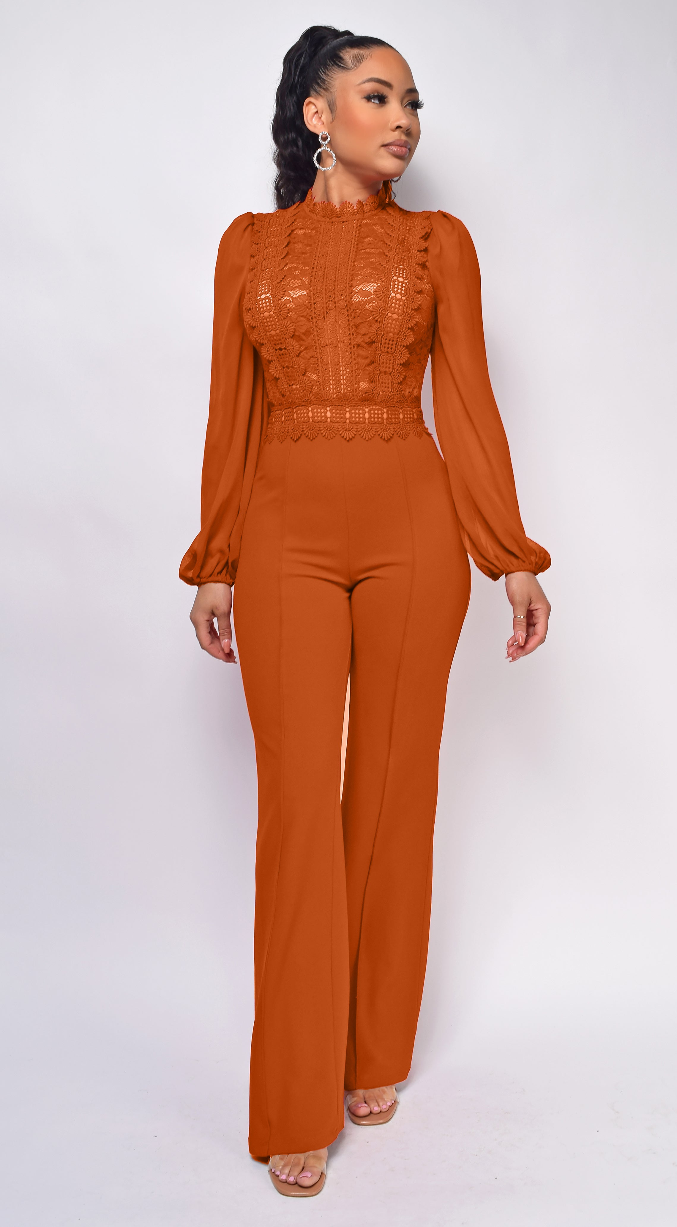 Nerine Crochet Lace Mesh Jumpsuit - Cognac Brown