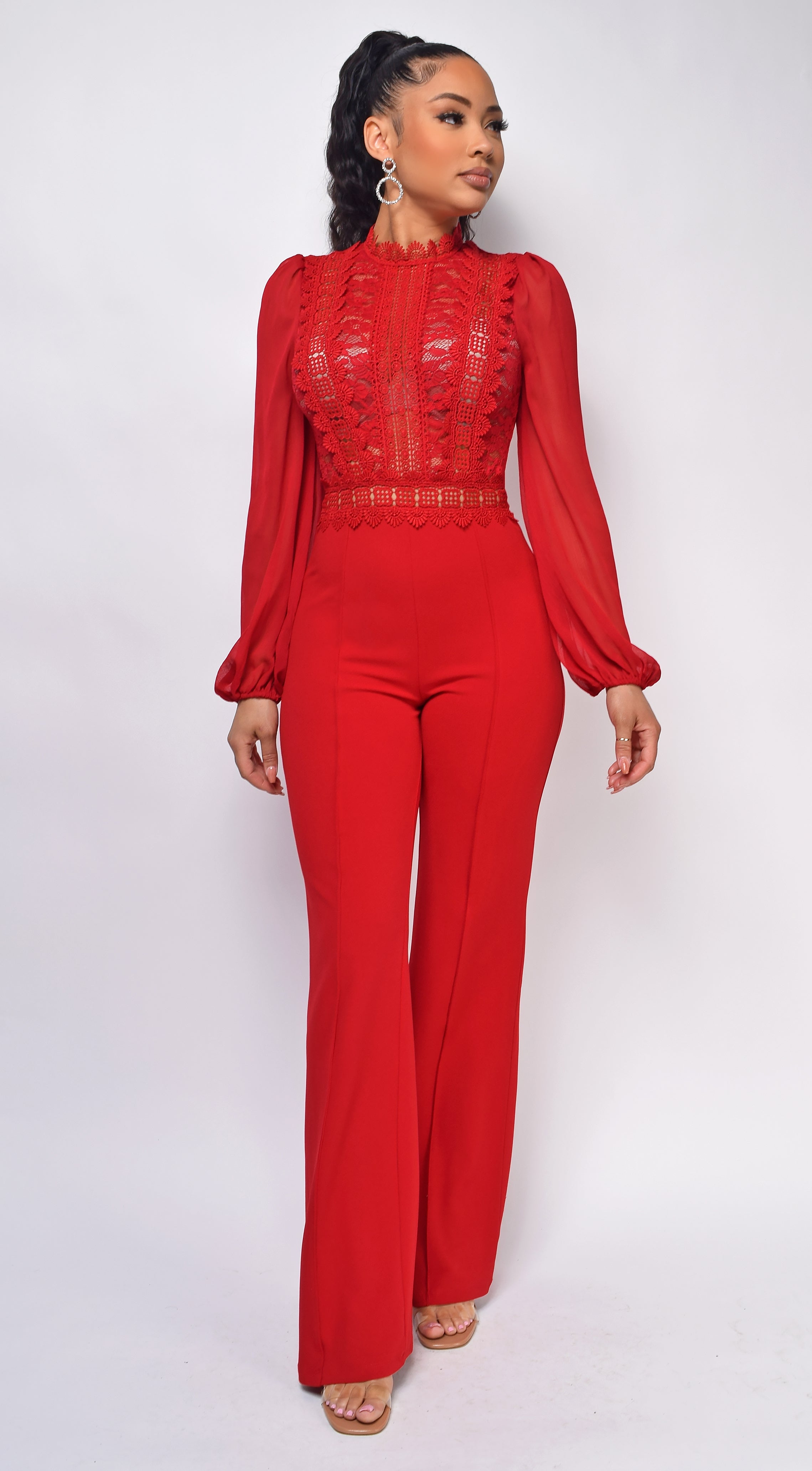 Nerine Crochet Lace Mesh Jumpsuit - Red