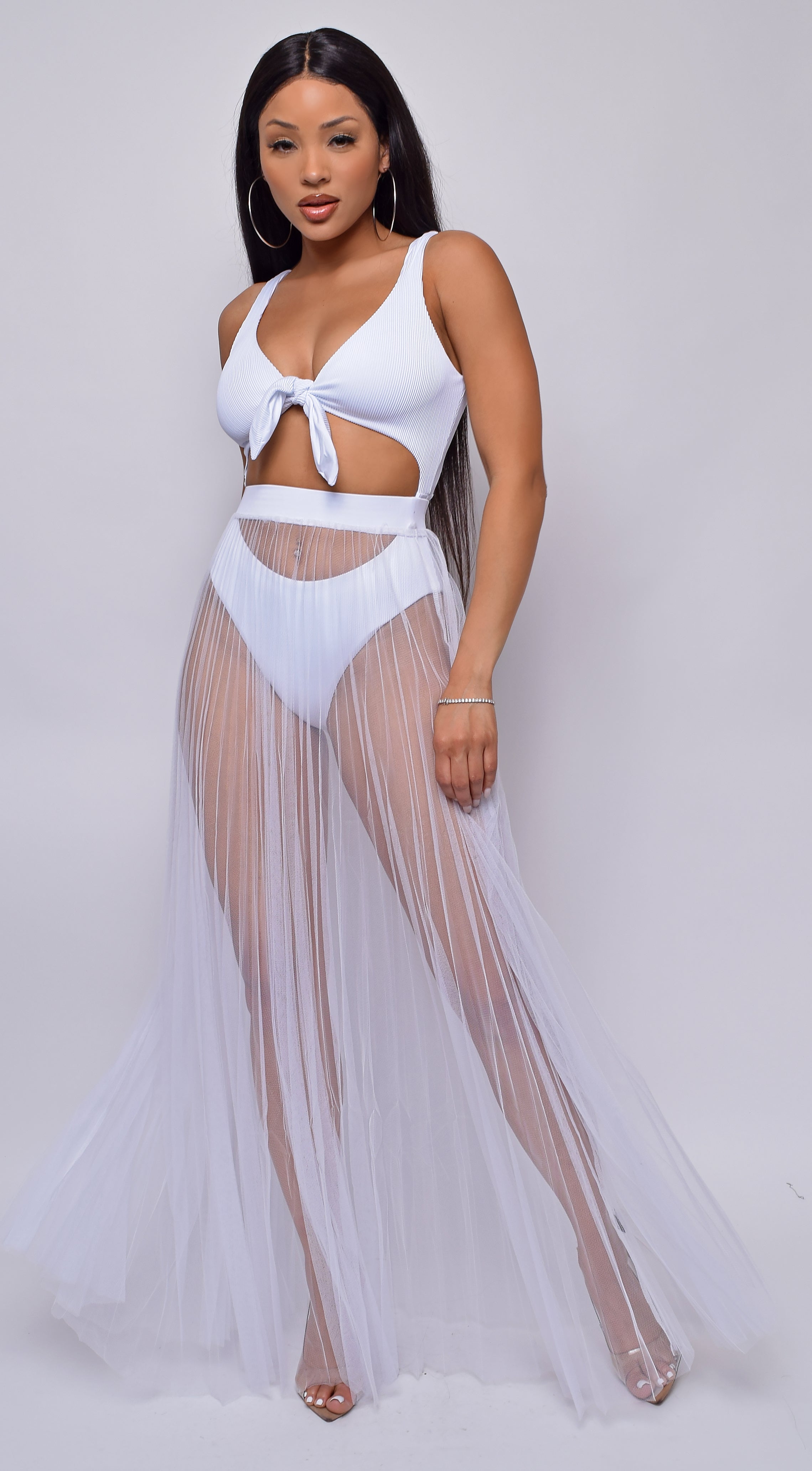 Palmaria White Pleated Sheer Tulle Maxi Cover-up Skirt