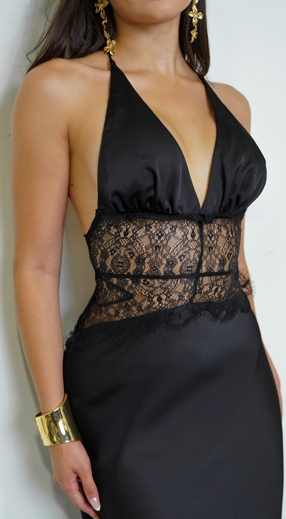 Ravena Lace Satin Detail Halter Maxi Dress - Black