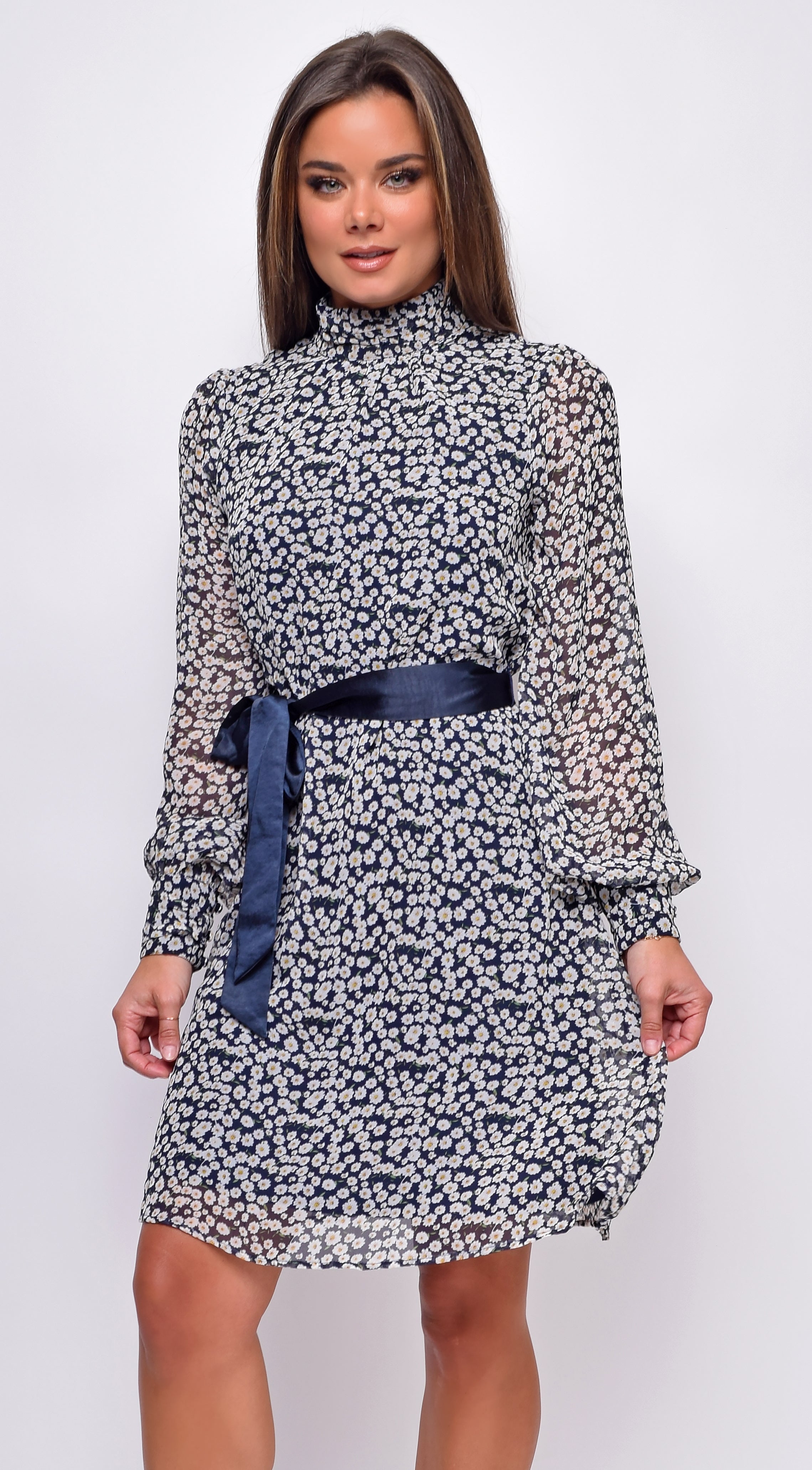 Sensation White Navy Floral Mock Neck Waist Tie Mini Dress