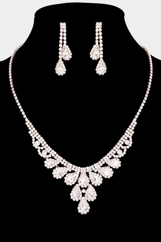 Sparkle Away Rose Gold Rhinestone Trim Teardrop Stone Accented Necklace & Earrings Set